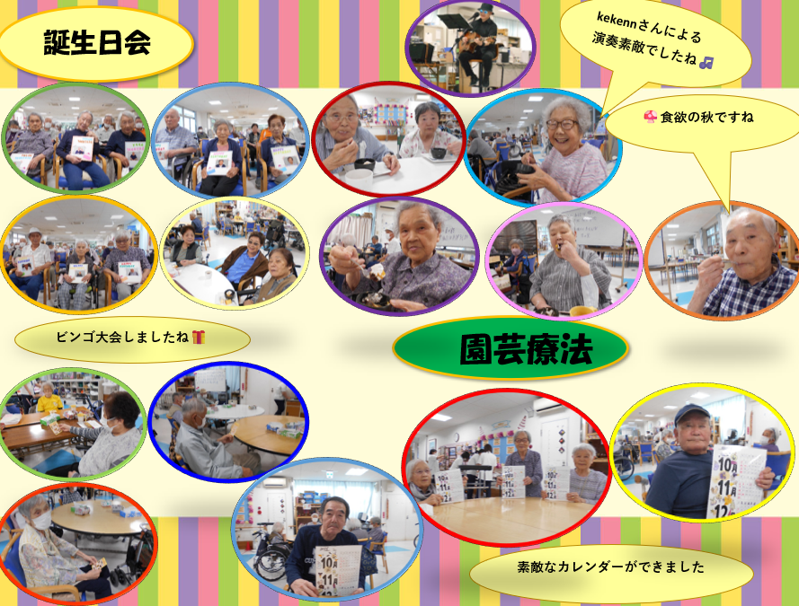 さて、9月の介護医療院ケアホーム山口デイケアでは、イベントでギター演奏を聴いたり、園芸療法でカレンダーを作ったりと、わきあいあいとした雰囲気の中、楽しい時間を過ごしました。